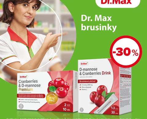 Při nákupu vybraných balení brusinek značky Dr. Max ušetří člen klientského programu Karta výhod 30% oproti ceně bez Karty výhod.
