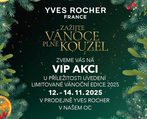 Přijďte ve dnech 12. – 14. 11. 2025 do prodejny rostlinné kosmetiky Yves Rocher a užijte si spolu s námi event u příležitosti uvedení limitované vánoční edice 2025. Objevíte limitované produkty s vůní zimních plodů, mandarinky a jehličí a karité s bergamotem a těšit se můžete také na spoustu tipů na dárky pro své blízké, odborné poradenství s diagnostikou pleti či krásný dárek k nákupu nad 599 Kč.